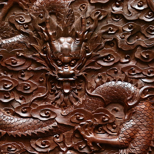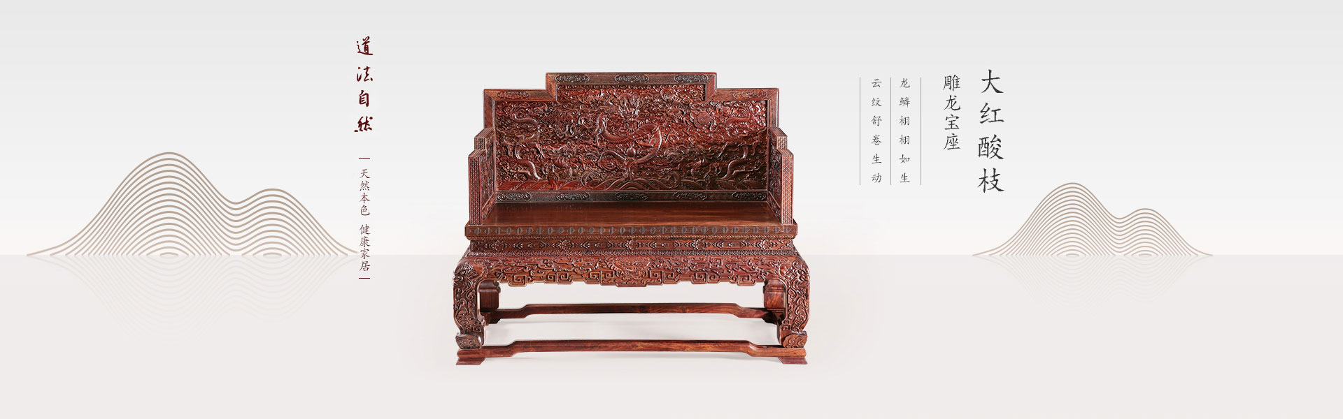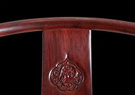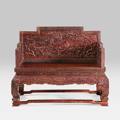 此寶座選用珍貴的大紅酸枝作為原材料,搭腦呈平頭狀,靠背中間高,向兩邊扶手遞減呈梯形。結構設計巧妙,對稱布局,每個面板皆雕著一條騰飛的金龍,刀法精密,圓潤渾厚;龍紋栩栩如生,云紋舒卷生動,龍的姿態(tài)各異,有的昂首前瞻,有的回首瞭望,動感十足。座面嵌裝硬板,束腰內(nèi)收,雕有纏連枝紋,四條三彎腿做同樣的獸首,足下踩有豐碩的地平,端莊穩(wěn)重。